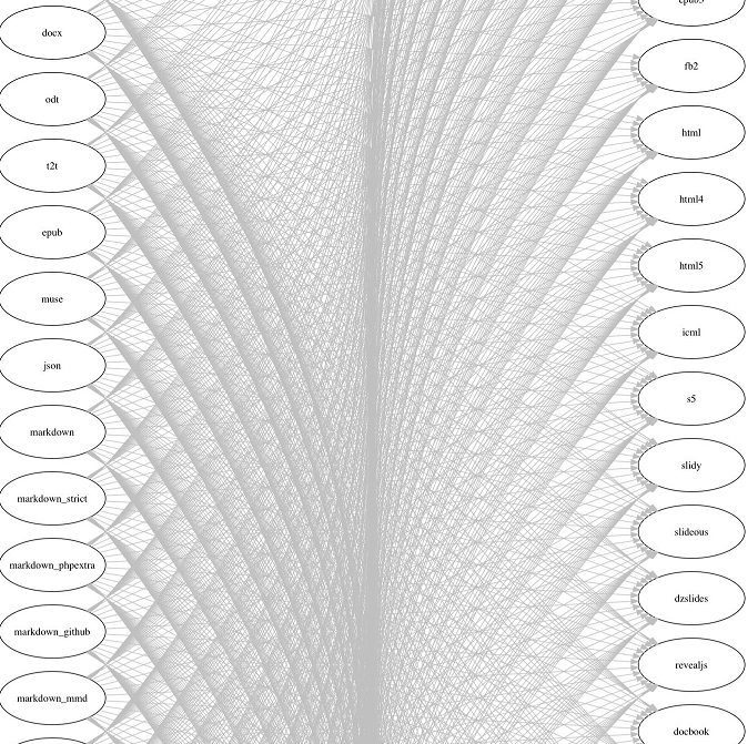 Pandoc 是全平台的转换工具,在命令行能够很方便的进行格式转换。 Pandoc 支持的格式及转换方式如下图所示。